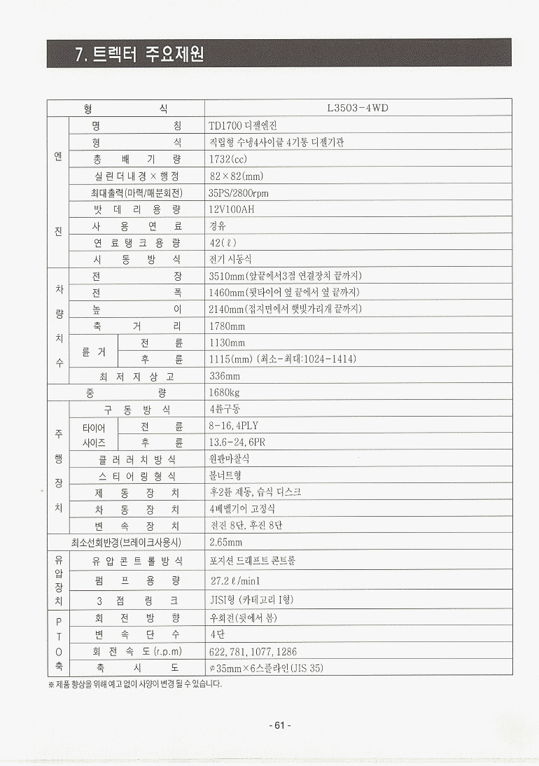 현재위치 : Home >> 트렉타 >> 대동트렉타 >> 등록책자 >> L3503 >> 제원표